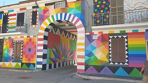 In the decades that followed, depopulation hollowed out many Abruzzo hill towns. Aielli’s response, beginning in earnest in 2017, was distinctive: it invited muralists from Italy and abroad to paint its walls, creating the project known as “Borgo Universo.” The initiative drew on the village’s existing connection to the sky — a 19th-century astronomical tower had long been one of its landmarks — and turned outward migration into a reason for reinvention.
