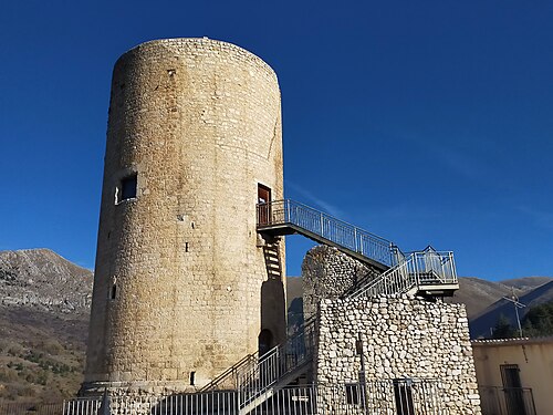 The tower rises from the upper village, a square structure dating to the 14th century. Originally built as a defensive lookout over the Fucino basin, it now hosts a small astronomical observatory and serves as the symbolic anchor of Borgo Universo. Climbing its interior staircase offers a direct line of sight across the drained lakebed to the mountains of the Sirente-Velino range beyond.